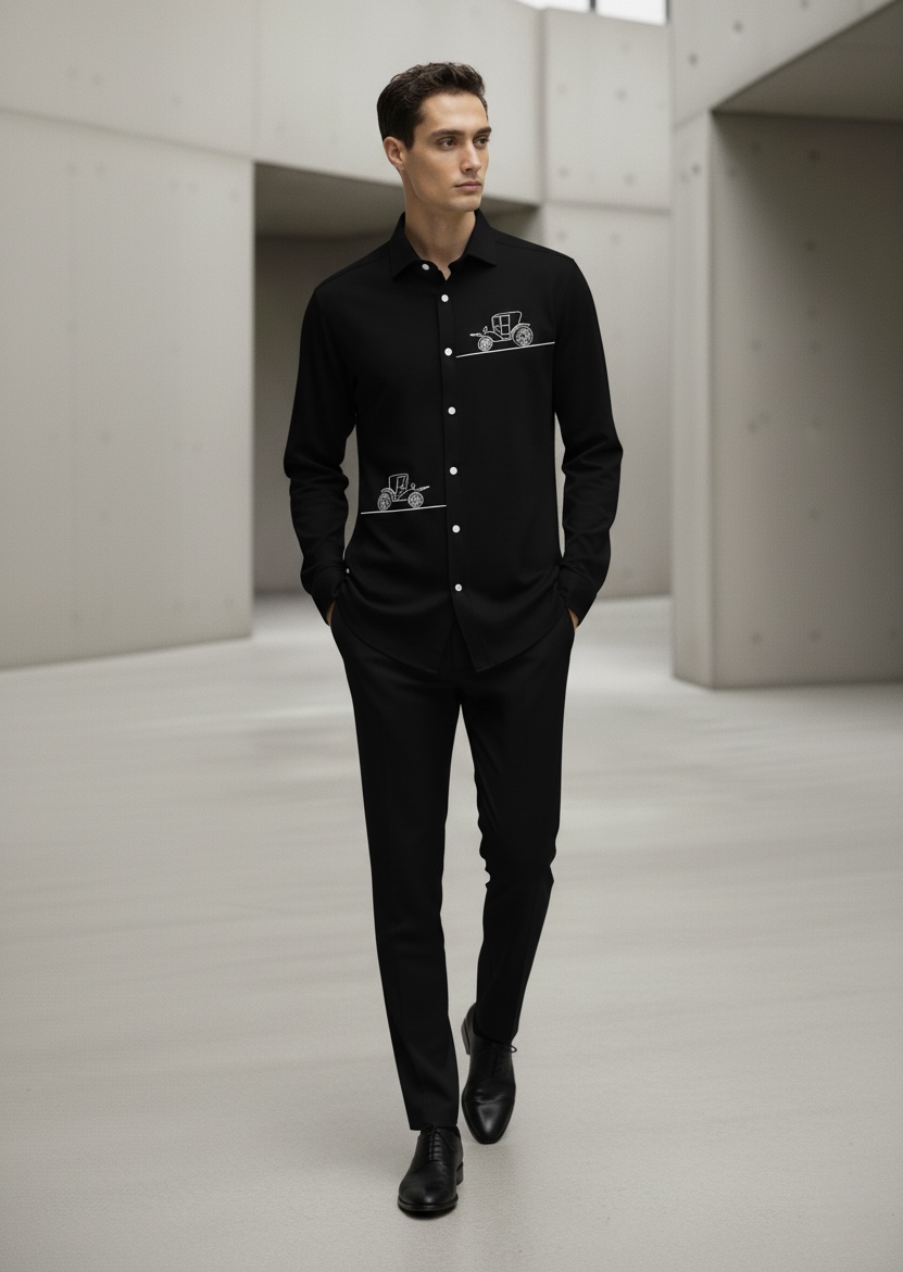 Introducing The Royal Ride, a classic black shirt featuring elegant carriage embroidery, symbolizing timeless sophistication and refined charm perfect for statement evenings.